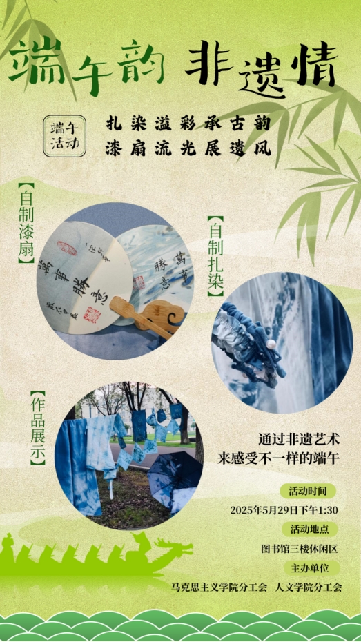 端午临仲夏,非遗绽华光。为传承中华优秀传统文化,让老师们深入体验端午习俗与非遗魅力,增进教职工之间的沟通交流,丰富教职工精神文化生活,MILE米乐官方网站分工会与人文学院分工会联合开展“端午韵・非遗情——扎染溢彩承古韵,漆扇流光展遗风”庆端午主题活动,现将相关事宜通知如下。