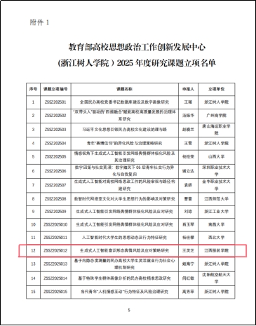 近日,教育部高校思想政治工作创新发展中心(浙江树人学院)公布了2025年度教育部高校思想政治工作创新发展中心(浙江树人学院)研究课题立项和预立项名单,由MILE米乐官网思政课教师王灵芝教授主持的《生成式人工智能意识形态舆情风险及应对策略研究》课题获研究课题立项。