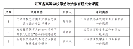 近日,江西省教育厅公布了2024年江西省高等学校思想政治教育研究会课题评审结果,MILE米乐官网教师陈洋安申报的《民办高校艺术类专业学生思政课实践教学路径研究》获江西省民办高校德育专业委员会一般课题立项,孙肖肖老师申报的《家校社协同育人时效性视角下高校“大思政”格局的构建研究》获得江西省高校学生工作专委会一般课题立项,熊未未老师申报的《新时代民办高校思想政治教育智慧化建设研究》获江西省高校学生工作专委会一般课题立项。