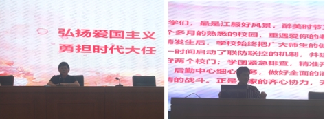 娄英英院长对同学们再次踏入校门,再聚江服大家庭表示欢迎。她指出,开学战疫思政一课主要通过共同聆听援鄂英雄的抗议故事,重温感受火线锤炼的抗疫精神来加强疫情防控知识教育,引导学生正确理性看待疫情,增强自我防范意识和防护能力,学会在困难和磨练中成长。
