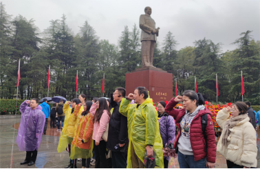 3月25日上午开启韶山之行的第一站,学员们来到毛泽东铜像广场。虽然下着雨,但丝毫没有影响大家的心情,看到来自全国各地的人们从四面八方赶来,怀着无比崇敬的心情,用各自不同的方式,缅怀这位缔造新中国的伟人毛泽东。全体学员列队向毛泽东铜像行鞠躬礼,并敬献花篮。在毛主席铜像下,全体党员面向鲜红的党旗,重温入党誓词。