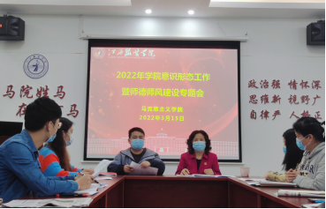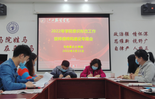 2022年3月15日下午,MILE米乐官方网站在学院活动室组织召开2022年意识形态工作暨师德师风建设专题会议,会议由学院党总支副书记陈洋安主持,学院院长周丽琴、副院长贺松兰、张龙龙及学院全体教师参加会议。