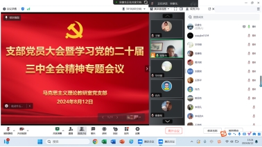 8月18日,思想政治教育教研室党支部召开支部党员大会,支部书记贺松兰同志组织全体党员同志深入学习习近平总书记重要讲话精神以及党的二十届三中全会精神。贺松兰同志强调,学习好宣传好贯彻好党的二十届三中全会精神是当前和今后一个时期的一项重大政治任务。思政课教师要学深悟透,在教学、科研、育人工作中落实全会精神。她带领支部同志们重点学习了“进一步全面深化改革的主题、目标、任务、重大原则、重大举措、根本保证等重要内容。”通过深入浅出的讲解,与会党员对会议精神有了更加清晰、深刻的理解。大家一致认为,《中共中央关于进一步全面深化改革、推进中国式现代化的决定》既是党的十八届三中全会以来全面深化改革的实践续篇,也是新征程推进中国式现代化的时代新篇,是我们党历史上又一重要纲领性文献。大家纷纷表示,将持续学习领会全会精神的核心要义和思想精髓,深学细悟笃行习近平总书记关于全面深化改革的一系列新思想、新观点、新论断,将党的二十届三中全会精神有效融入新学期思政课堂,用党的创新理论成果培养担当民族复兴重任的时代新人。