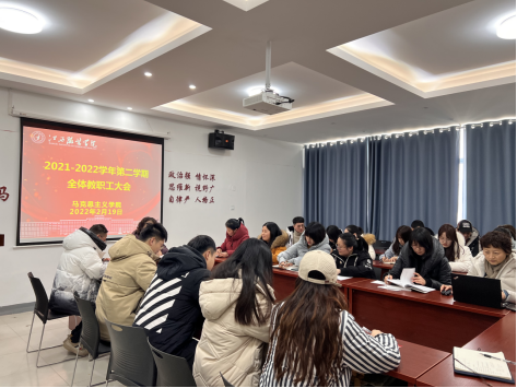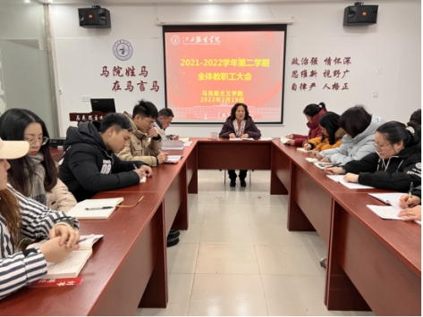 最后,学院院长周丽琴传达涂顺强理事长、薛家宝校长在新学期全体中层干部大会讲话精神,同时对学院2022年整体工作进行安排,新的一年学院全体教职工要坚持立德树人根本任务,要与学校的发展共频率,做好教书育人的良心事业,向全体教职工提出五点要求,强调:一是要加强组织纪律性,规范工作开展,确保学院教学、行政、党建等工作做实做细;二是要规范教学工作,上好思政课、讲好思政课是思政课教师的根本任务,要注重课程管理,落实立德树人根本任务;三是要增强工作积极性、主动性、创新性、超前性,工作要有突破,工作创新有特色;四是对待工作要高标准、严要求、高效率,攻破工作中的难点,把握工作重点,实现马院发展新成效;五是要善待自己、善待学生、善待同事,全体教职工要团结一致,齐心协力,互相帮助,共同提高,新的一年要有新的目标,希望在全体教职工的共同努力下,学院在新的一年再上新的台阶,以优异成绩迎接党的二十大顺利召开。