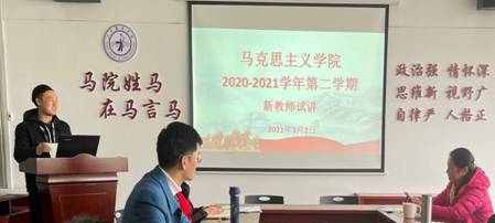 新任课青年教师李思雅、新进青年教师朱棣文分别进行了《中国近现代史纲要》《思想道德修养和法律基础》两门课程的试讲。院领导及教师对俩位教师的试讲进行了点评和讨论。最后周院长强调思政课教学必须紧扣教育部2018年版思政课专题教学指南,融入“四史”教育尤其是要结合今年建党100周年党史教育活动,讲好思政课。