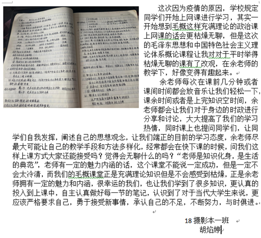 通过余老师的幽默风趣的讲授,不仅让学生学习到了知识,也为学生树立正确的世界观、人生观、价值观等提供了导向作用,实现了立德树人的根本目标,使之能够更自觉地以马列主义、毛泽东思想、邓小平理论、“三个代表”重要思想、科学发展观及习近平新时代中国特色社会主义思想作为自己的行动指南,立志在新时代为实现中华民族伟大复兴贡献力量。