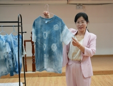 在扎染环节,主持人一边耐心细致地介绍扎染工艺的历史渊源和文化内涵,一边亲自示范如何使用玻璃珠、图案、棒签、橡皮筋等工具在T恤上创造出不同的图案。待示范结束,老师们充分发挥想象力,将白色T恤折叠、捆扎,有的扎出精巧的花朵图案,有的设计出独特的几何形状。随后,设计好的T恤放置在清水中浸泡15~20分钟,再放入染料桶内浸泡染色,经过氧化清洗后,一件件色彩斑斓、独一无二的DIY扎染T恤新鲜出炉。