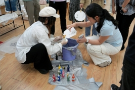 漆扇环节同样精彩纷呈。现场同学为每位老师发放了不同形状的扇子。老师们根据自己的喜好,精心挑选颜色,将颜料滴入水中,看着颜料在水面晕染开,形成绚丽的色彩纹路。随后,他们将扇子缓缓浸入水中,让颜料与扇面完美融合,在水波的荡漾中,独特的图案悄然形成。经过晾干等后续处理,一把把精美的漆扇诞生,或清新淡雅,或色彩浓烈,每一把都凝聚着老师们的巧思与创意。