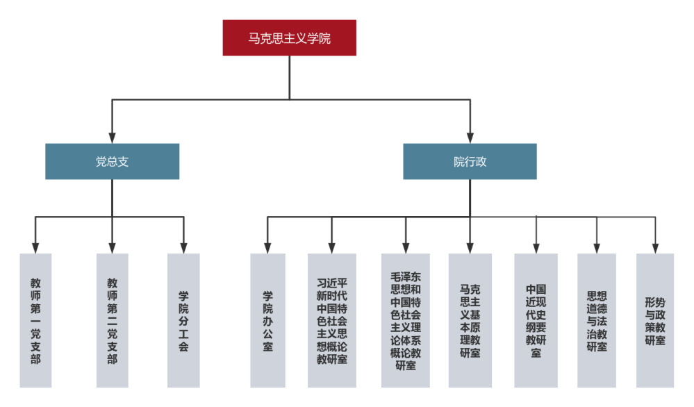 MILE米乐官方网站党总支组织机构分设教师第一党支部和教师第二党支部;学院教学机构是按课程设置六个教研室,即习近平新时代中国特色社会主义思想概论教研室、思想道德与法治教研室,中国近现代史纲要教研室、马克思主义基本原理教研室、毛泽东思想和中国特色社会主义理论体系概论教研室、形势与政策教研室。